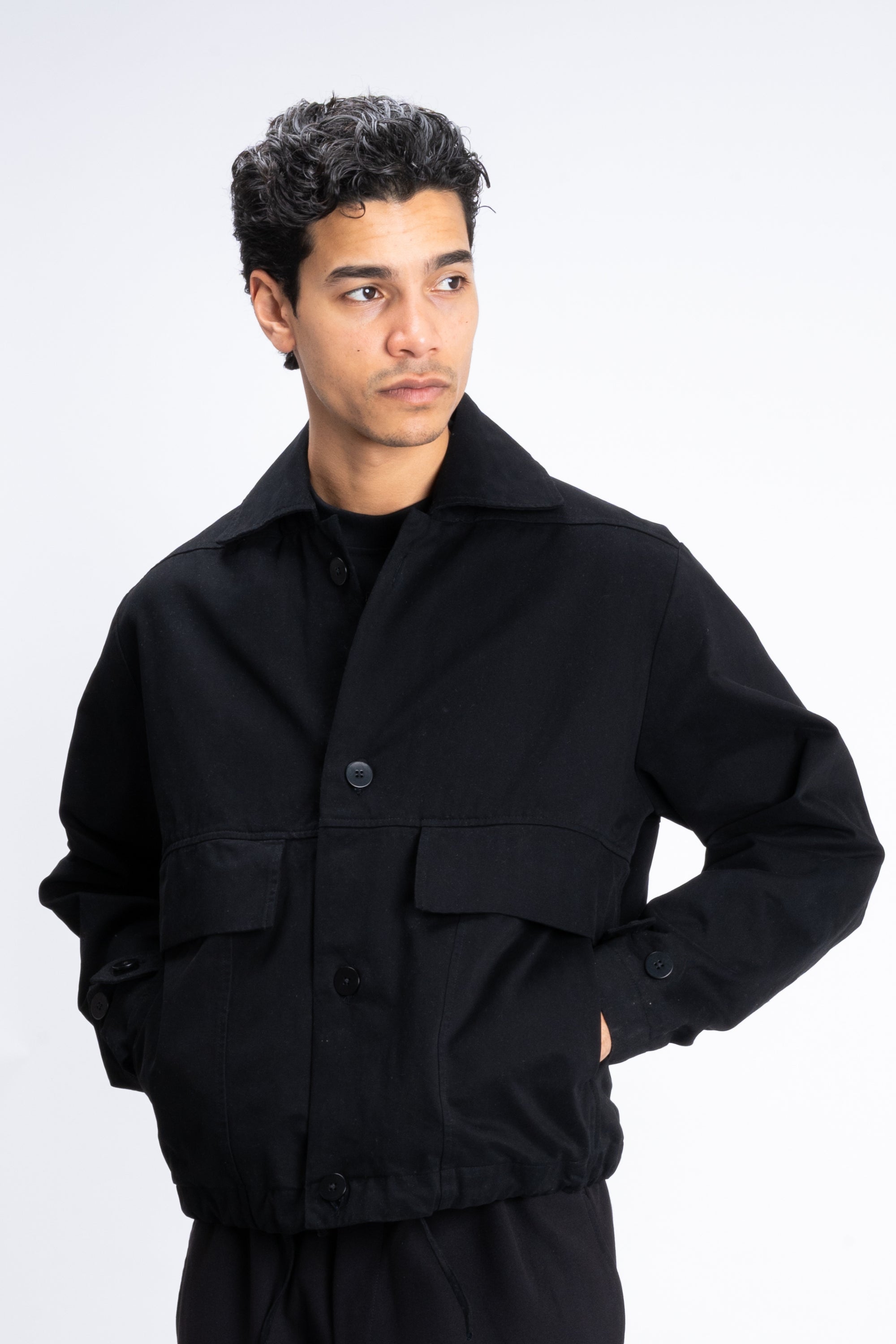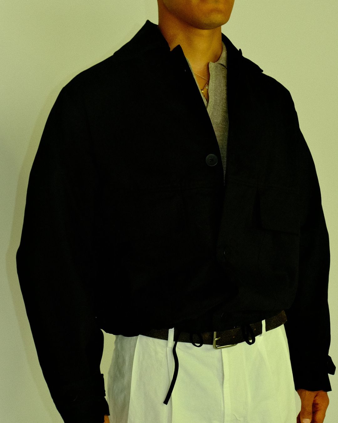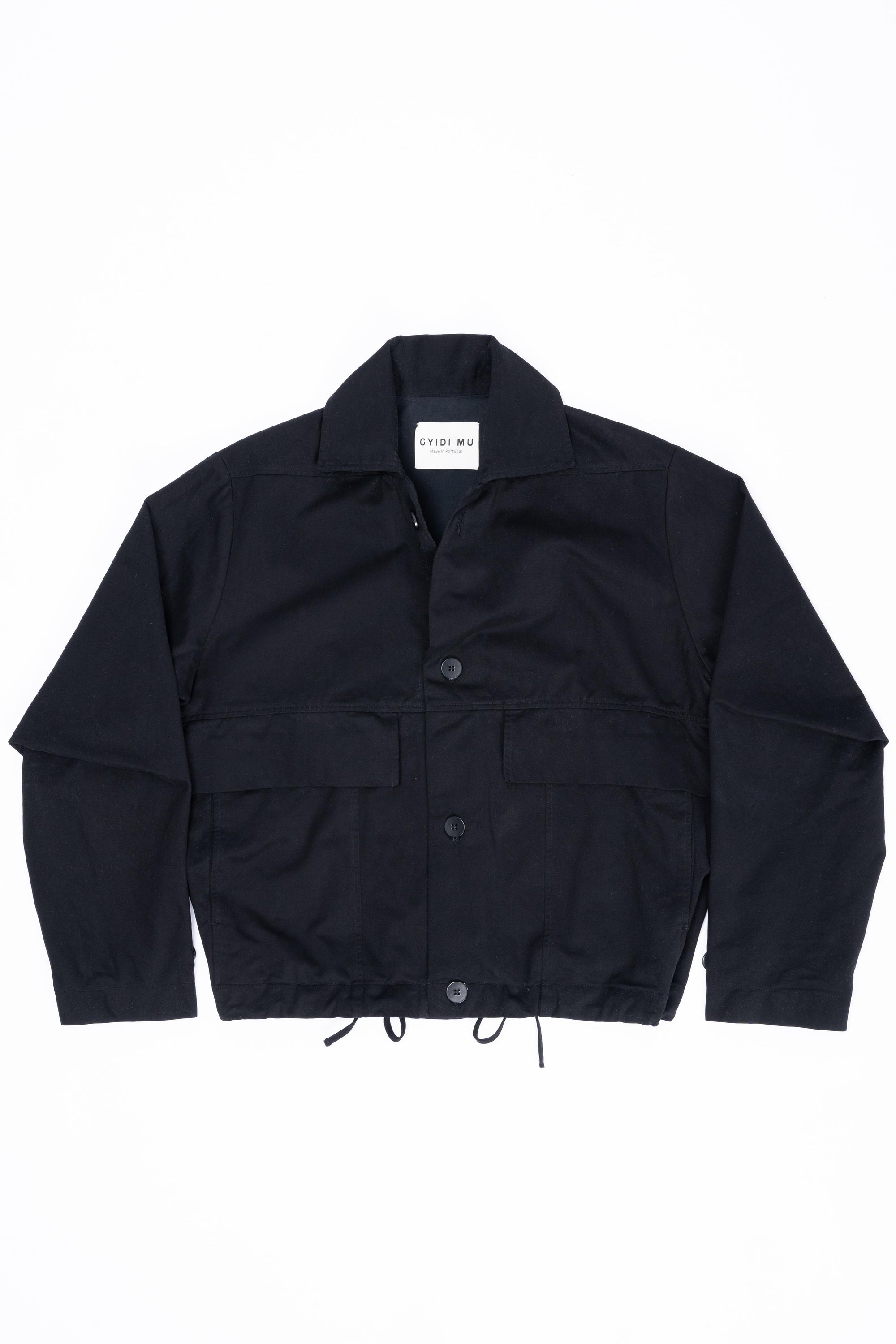Crafted in Portugal from brushed cotton with a full cotton lining. Designed with a slightly dropped shoulder and structured collar that aligns cleanly with the shoulder seam for a structured silhouette. Front and side-entry pockets, an adjustable drawcord hem, and tonal Corozo buttons (made from the nut of the tag palm tree). Finished in triple black with a discreetly embroidered GYIDI MU logo at the upper back.