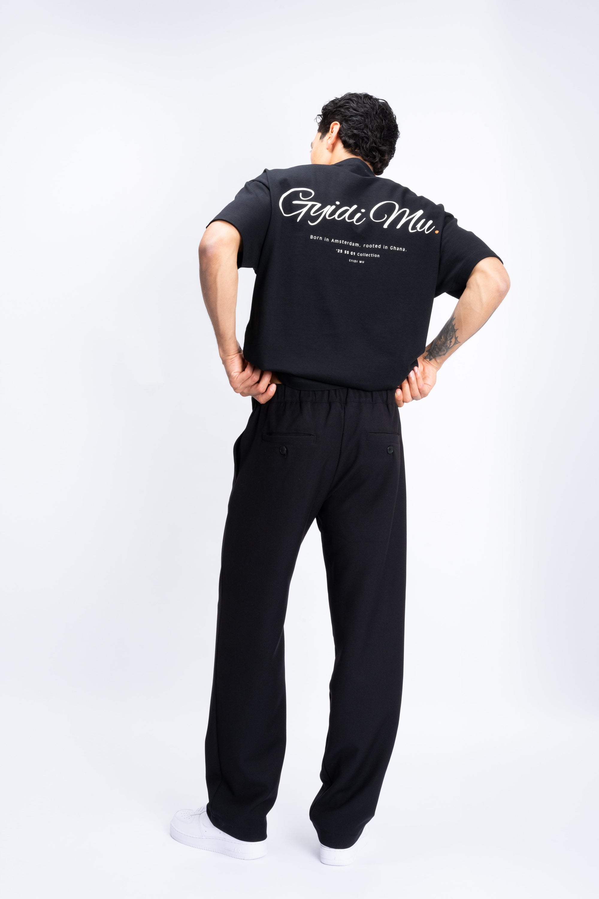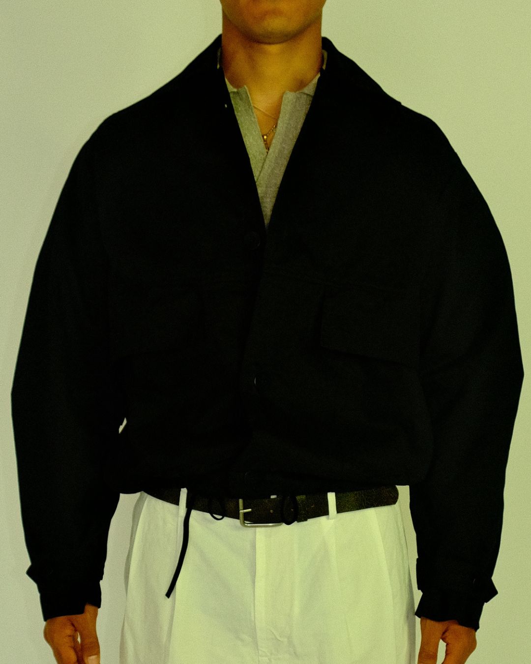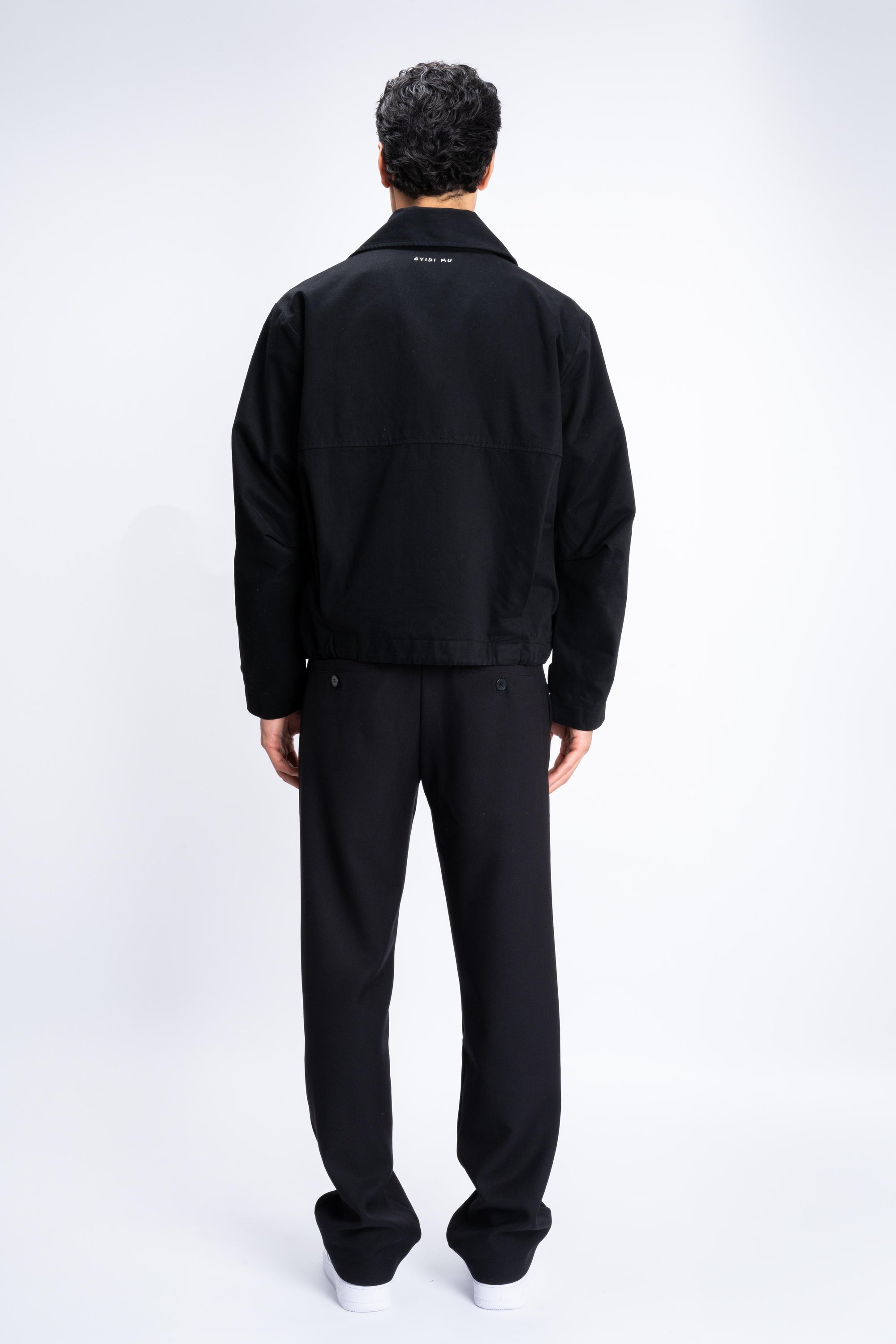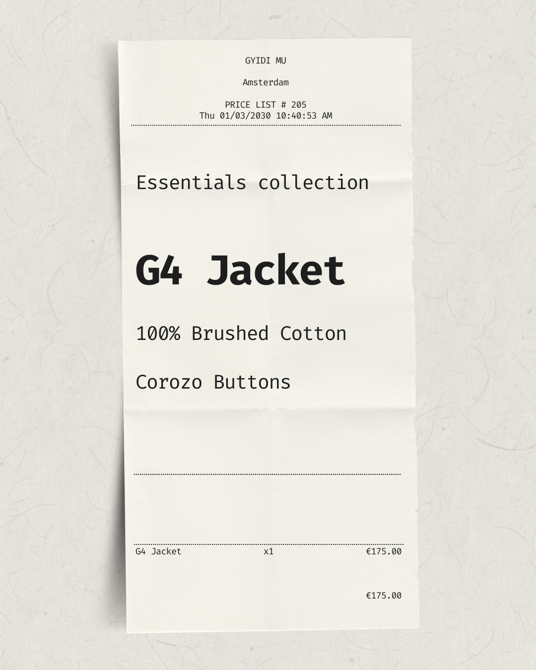 Crafted in Portugal from brushed cotton with a full cotton lining. Designed with a slightly dropped shoulder and structured collar that aligns cleanly with the shoulder seam for a structured silhouette. Front and side-entry pockets, an adjustable drawcord hem, and tonal Corozo buttons (made from the nut of the tag palm tree). Finished in triple black with a discreetly embroidered GYIDI MU logo at the upper back.
